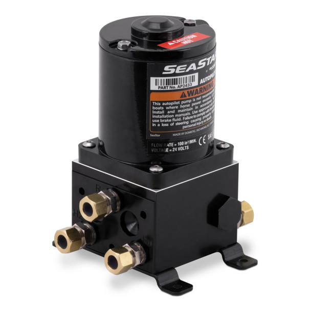 The Dometic SeaStar AP2433 is a highly reliable, plug n play autopilot pump that comes in 12 or 24 volt configurations and two fixed flows 60 cu. in./min and 110 cu. in./min. The autopilot pump is a reversible type set that uses an internal hydraulic gear pump. It is fairly compact (see pictures) and produces very little noise and vibration. It is primarily used as a stand alone pilot pump on boats or it can be retrofitted to a SeaStar P/A unit.